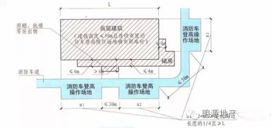 1)高層建筑應至少沿一個長邊或周邊長度的l/4且不小于一個長邊長度的底邊連續(xù)布置消防車登高操作場地,該范圍內(nèi)的裙房進深不應大于4米;